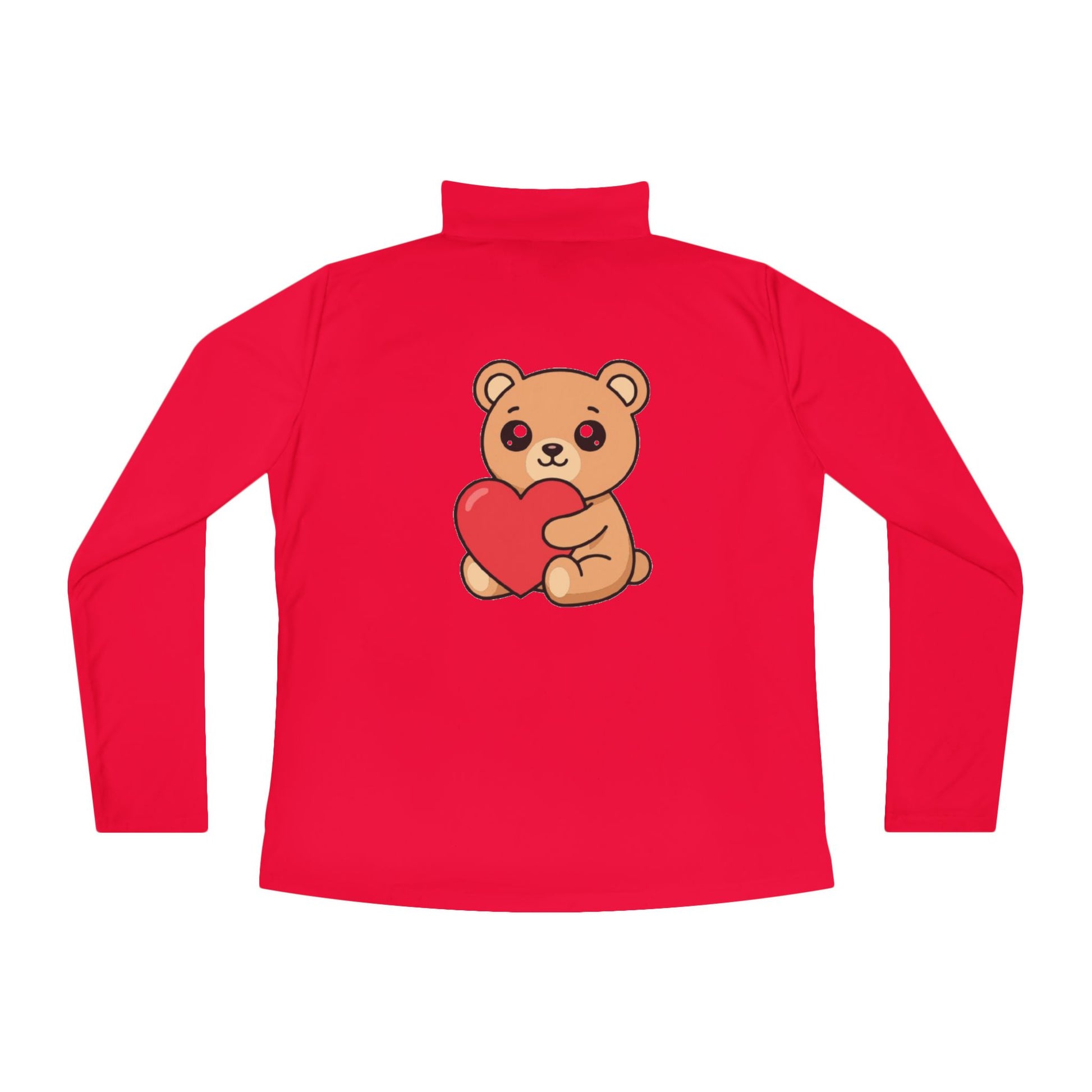 This lightweight quarter-zip pullover brings a soft, playful energy to everyday movement. The athletic cut and extra-light 100% polyester fabric layer like a second skin — breathable, quick-drying, and made to keep up with walks, errands, or neighborhood games. A small, sweet bear holding a red heart sits on the chest while a larger version rests on the back, adding a warm, whimsical touch that reads as both sporty and sincere. The cadet collar and durable reverse-coil zipper give gentle neck coverage and easy layering, and the dropped-tail hem adds coverage during active moments. Wear it when you want cozy, casual comfort with a tiny, heartfelt statement.